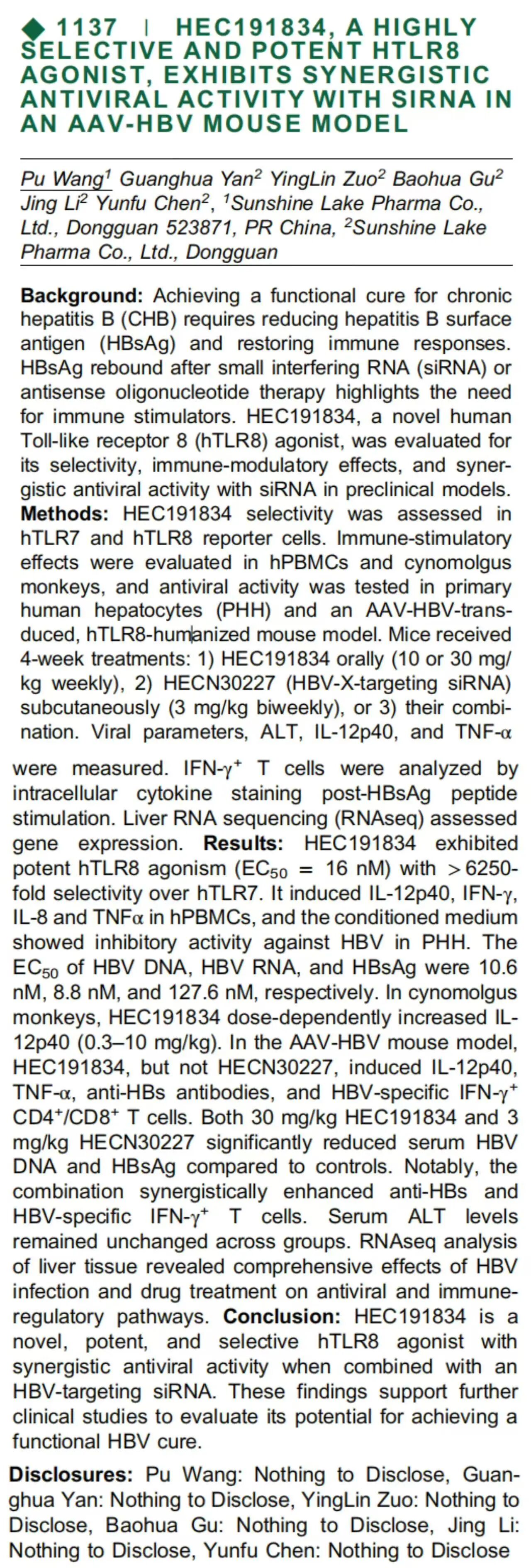 近日,HECN30227与公司自研的高选择性hTLR8免疫激动剂临床前联合用药的重要研究成果,入选2025年美国肝脏疾病研究学会年会(AASLD)“Poster of Distinction”,该称号仅授予评分位列前10%的成果,标志着国际权威学术机构对HECN30227联用组合临床开发潜力的高度认可。